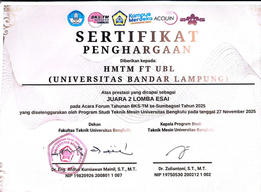 Prestasi membanggakan berhasil diraih oleh Himpunan Mahasiswa Teknik Mesin FT UBL yang sukses memperoleh Juara 2 dalam Lomba Esai tingkat Sumbagsel. Kemenangan ini menjadi bukti bahwa mahasiswa Universitas Bandar Lampung mampu bersaing dan menunjukkan kualitas intelektualnya di tingkat regional. Melalui gagasan inovatif, analisis yang mendalam, dan penyampaian argumen yang sistematis, karya tim HMTM FT UBL mampu menarik perhatian serta mendapatkan apresiasi dari dewan juri. Capaian ini tidak hanya menjadi kebanggaan tim, tetapi juga menjadi motivasi besar bagi seluruh keluarga besar Teknik Mesin UBL untuk terus berkembang, berkarya, serta meningkatkan budaya literasi dan penelitian di lingkungan kampus. Perjalanan panjang dalam menyusun ide, melakukan riset, dan memfinalisasi karya akhirnya membuahkan hasil manis yang patut diapresiasi. Prestasi ini diharapkan mendorong munculnya generasi mahasiswa yang lebih kritis, kreatif, dan berprestasi di masa mendatang.